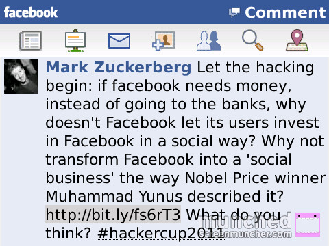 “Let the hacking begin: If facebook needs money, instead of going to the banks, why doesn’t Facebook let its users invest in Facebook in a social way? Why not transform Facebook into a ‘social business’ the way Nobel Price winner Muhammad Yunus described it?http://bit.ly/fs6rT3 What do you think? #hackercup2011”